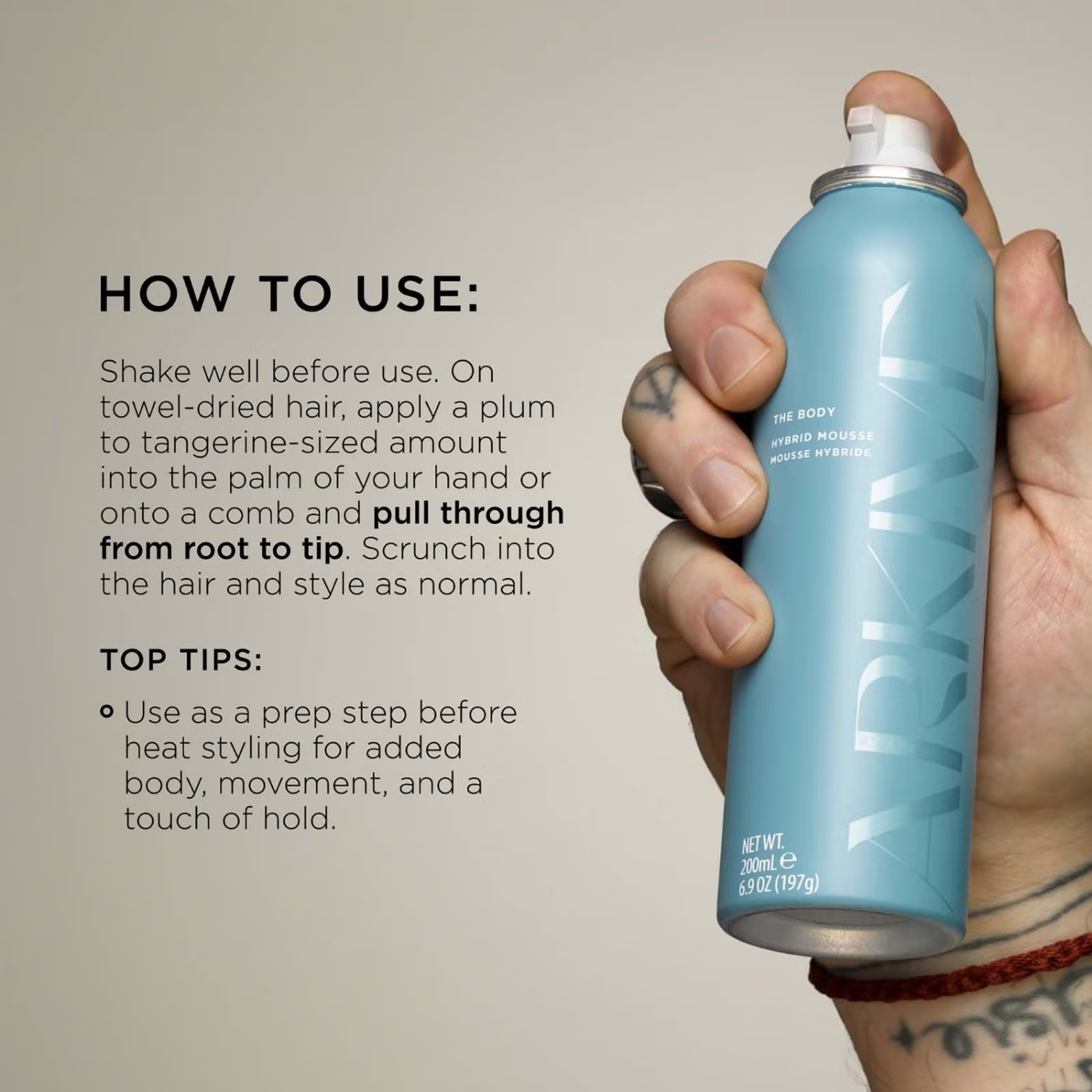 Boost volume and shine with The Body Hybrid Mousse from ARKIVE Headcare, a strong-hold, lightweight styling mousse designed to deliver fuller-looking lengths and multi-dimensional gloss. Ideal for all hair types, this mousse enhances the appearance of every hairstyle—from bouncy curls to sleek, nineties-inspired blowouts—while maintaining natural movement and softness.