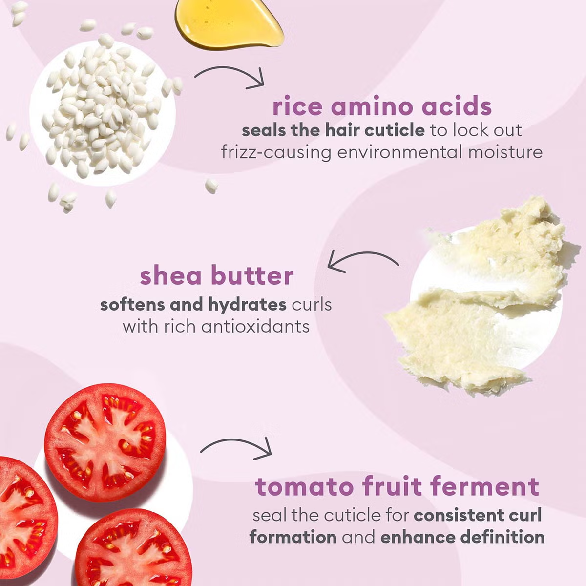 Powered by rice amino acids, the conditioner deeply hydrates dry strands to restore strength, elasticity, and bounce. Tomato fruit ferment and mollis leaf extract help boost curl shape and resilience, while a blend of shea butter and sweet almond oil delivers antioxidant-rich, lightweight moisture without weighing hair down.