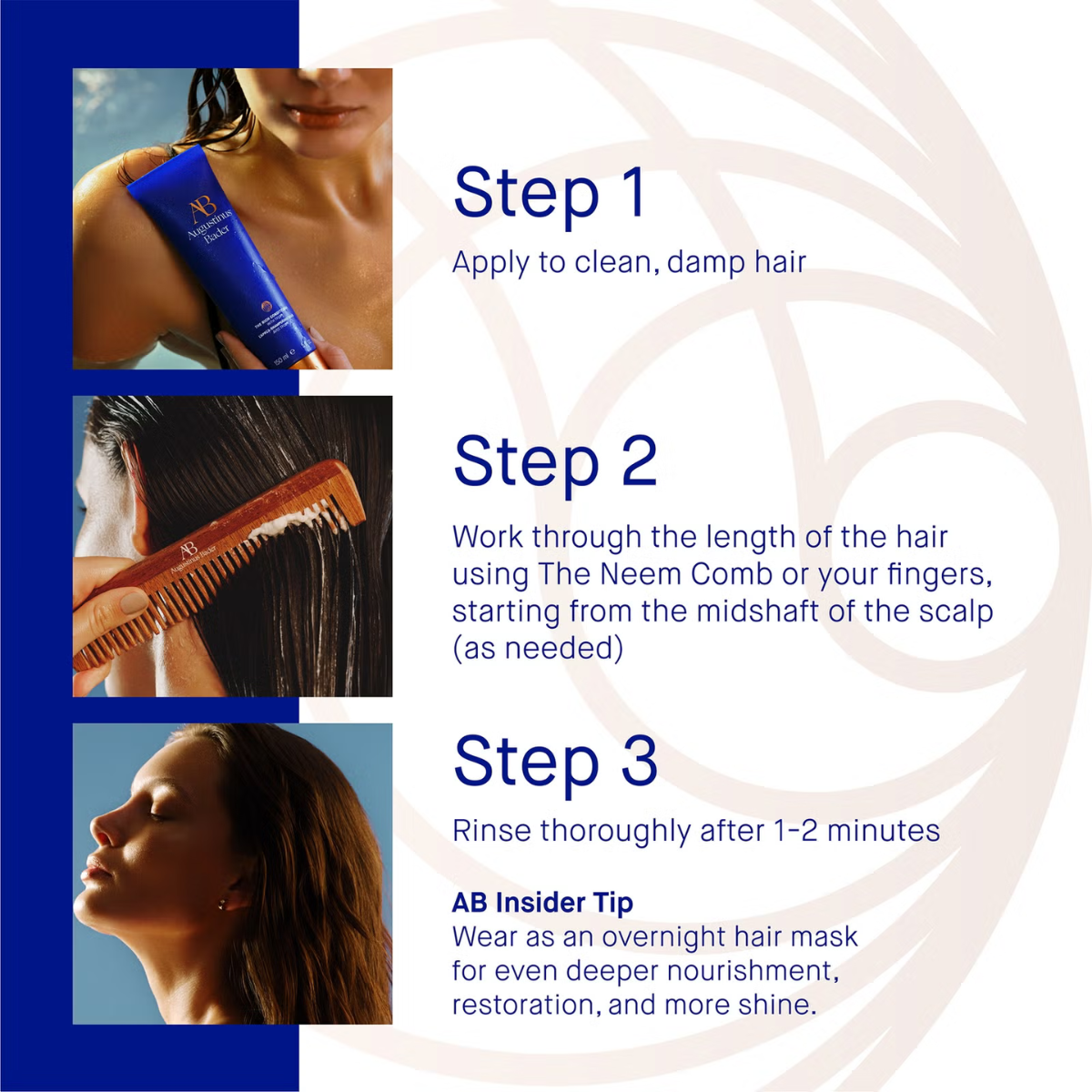Use after The Shampoo for a complete Augustinus Bader haircare ritual. For best results, apply to lengths and ends, leave on for 1–2 minutes, then rinse thoroughly.