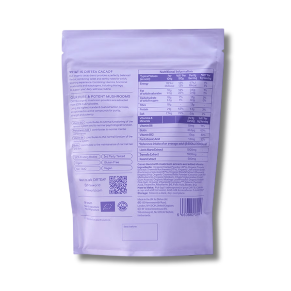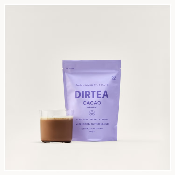 Indulge in a rich, velvety cup of DIRTEA Cacao Super Blend Hot Chocolate—your perfect daily wellness companion. Crafted with premium cacao and infused with powerful adaptogenic mushrooms like tremella, reishi, and lion’s mane, this nourishing drink is designed to elevate both your mood and routine. Enhanced with a carefully selected blend of organic B vitamins—including B6, B12, biotin, and pantothenic acid—it supports energy levels, focus, and overall well-being. Whether you’re starting your morning or unwinding in the evening, simply mix 6g of this smooth, delicious powder with hot or cold water or milk for a comforting and functional treat that fits seamlessly into your lifestyle.