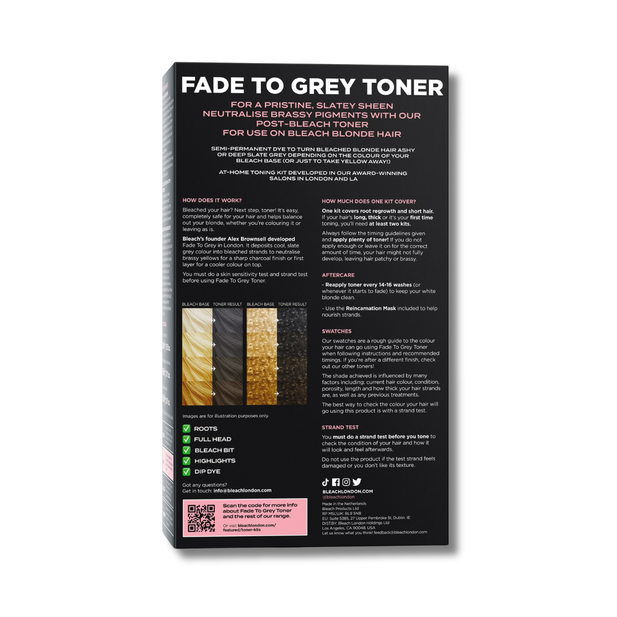 Achieve a cool-toned transformation with the BLEACH LONDON Fade To Grey Kit, a semi-permanent charcoal grey hair toner designed to enhance pre-lightened, bleached, or highlighted blonde hair. This at-home colouring kit delivers soft, smoky grey tones that create a modern, salon-quality finish while helping to neutralise warmth and brassiness. The colour gradually fades over approximately 16–20 washes, making it ideal for those who want a temporary yet stylish hair refresh. Packaged in recycled cardboard and formulated with a vegan, cruelty-free approach, it offers a more conscious way to experiment with colour.