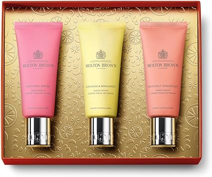 About this item: Our Hand Cream trio is here to keep your hands happy in winter. It comes with cozy spice, refreshing citrus, and yummy fruity scents. Each lotion has shea butter to make your hands feel soft. The Christmas packaging is super cool, with a golden rattan pattern. It's a nod to the material we used in our first salon in the 1970s on South Molton Street.